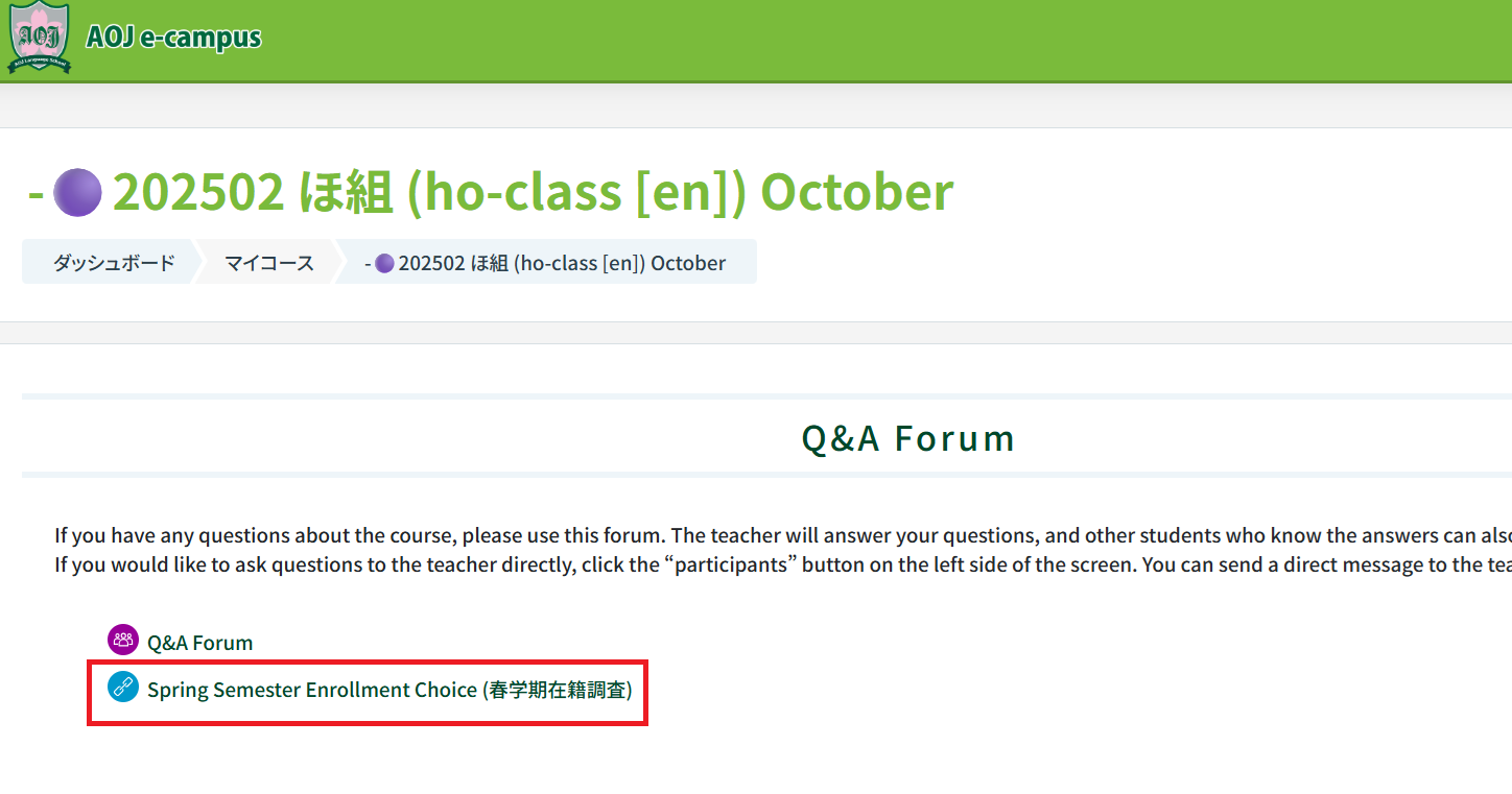 AOJ e-campusで所属するクラスに入って、「Q&A Forum」の下にある「春学期の在籍調査」というリンクをクリックして、フォームにご記入ください。